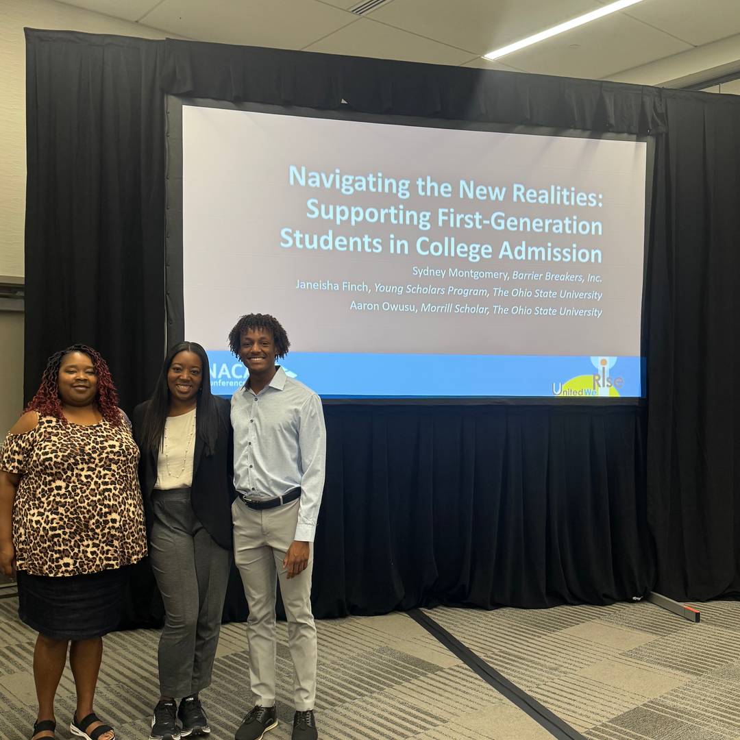 - Presented our session, “Navigating the New Realities: Supporting First-Generation Students in College Admission.” Alongside our founder, Sydney Montgomery, panelists included Janeisha Finch (Dayton Young Scholars Program Manager at Ohio State University) and Aaron Owusu, Barrier Breakers alum, Eritrean-American Olympian, and current OSU student in the Morrill Scholars Program. Together, they unpacked how shifting DEI policies, financial aid challenges, and disparities in readiness are impacting first-gen applicants, the importance of early identification of first-generation students for long-term success,—and offered practical strategies universities and counselors can implement to better support them.